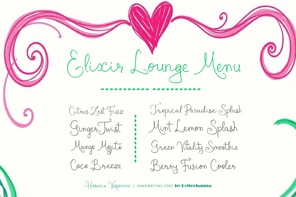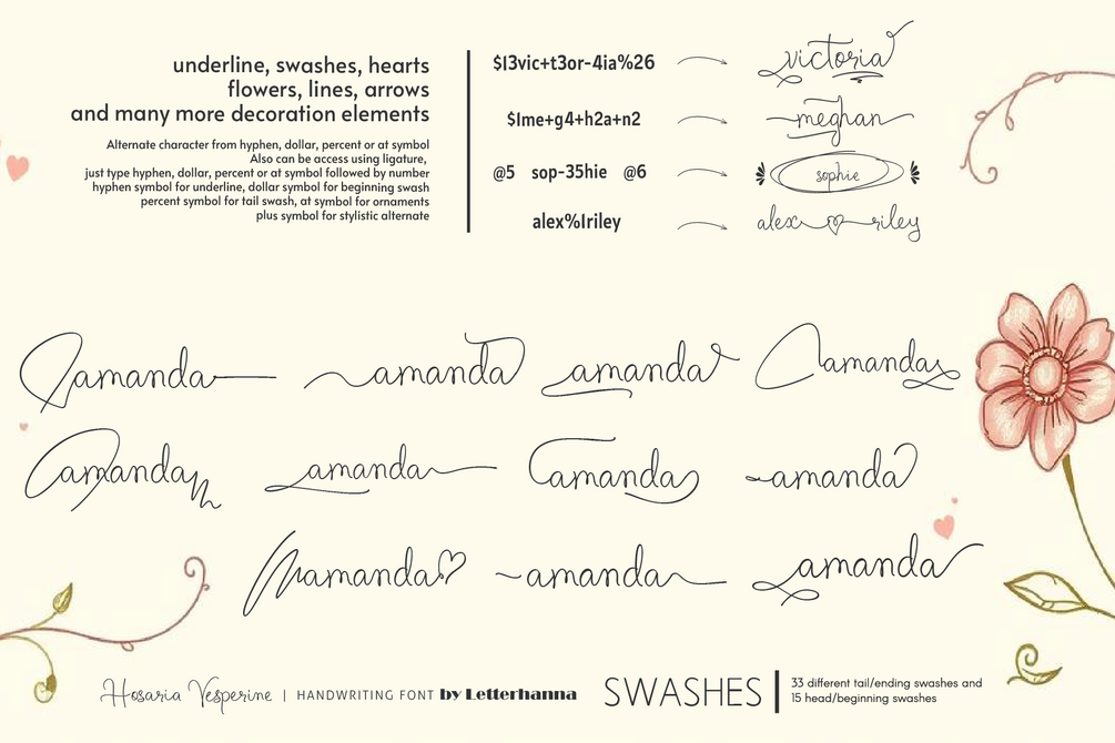 Gain easy access to all alternate glyphs, swashes, ornaments, and underlines by simply using ligatures. You can try them out yourself in the font preview tool on our website, letterhanna.com