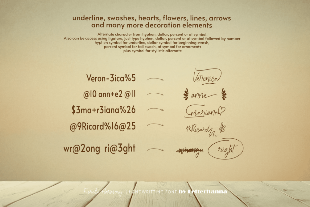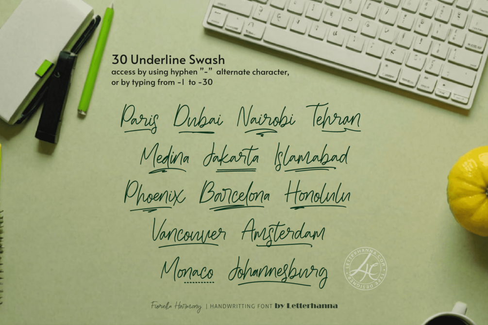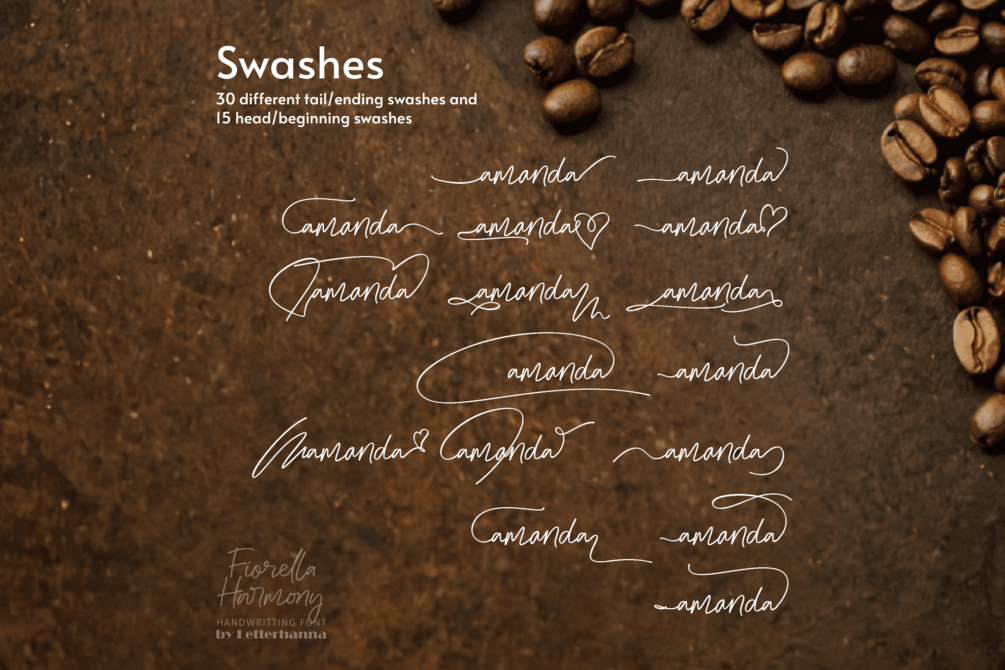 Gain easy access to all alternate glyphs, swashes, ornaments, and underlines by simply using ligatures. You can try them out yourself in the font preview tool on our website, letterhanna.com.