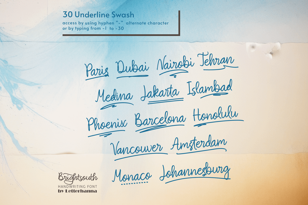 Gain easy access to all alternate glyphs, swashes, ornaments, and underlines by simply using ligatures. You can try them out yourself in the font preview tool on our website, letterhanna.com.