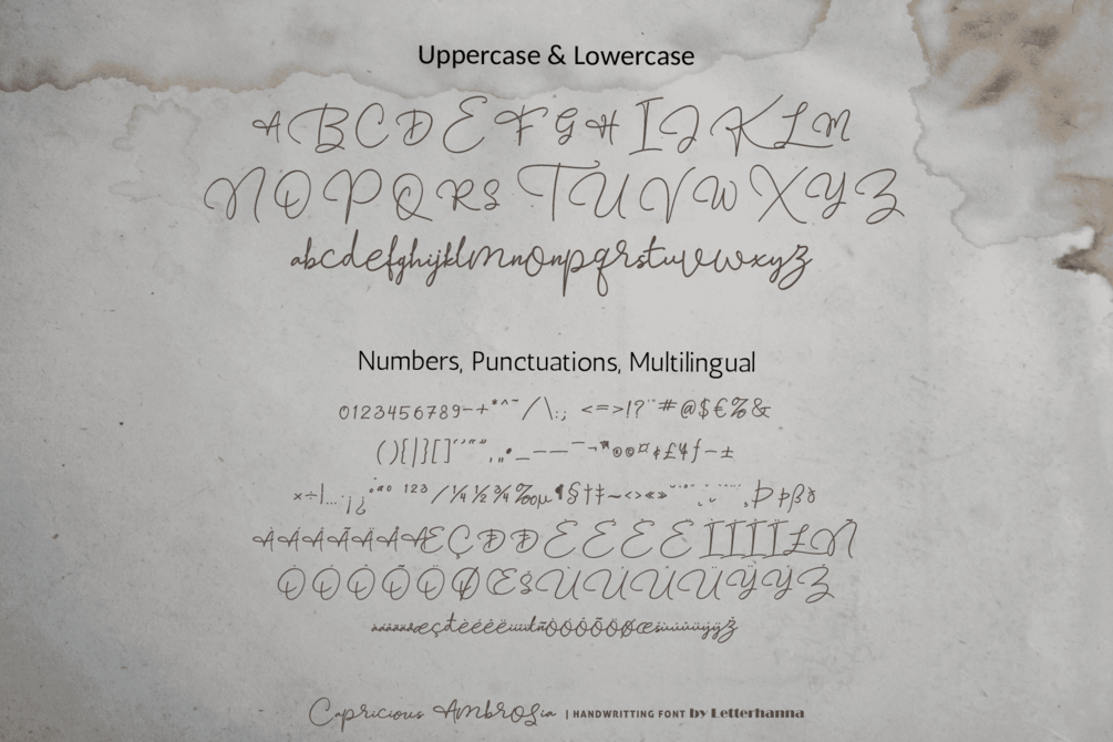 Capricious Ambrosia Font was created to look as close to a natural handwritten script as possible by including over 45 natural-looking opentype ligatures, Uppercase and lowercase Stylistic Alternate, a lot of head/beginning swashes and tail/ending swashes. There are also underline swashes included and lot more ornaments, arrow, scribbles, etc.