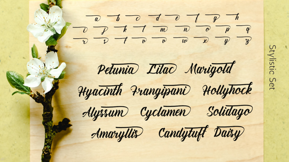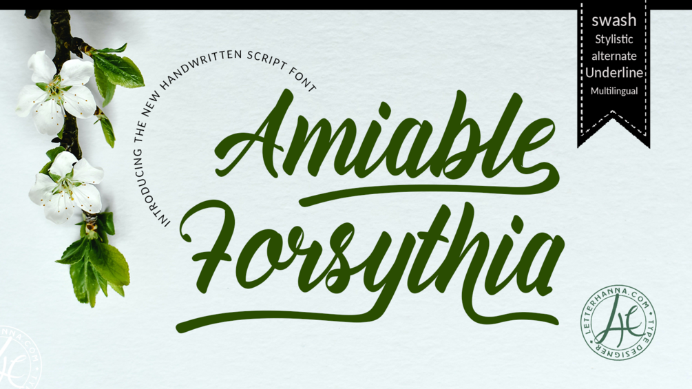 Amiable Forsythia comes with stylistic alternate, ligatures, swashes, and multilingual support.