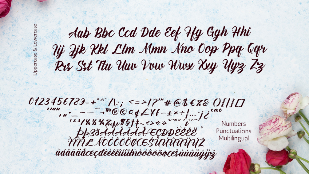 This font is also PUA encoded which means you can access all of the glyphs and swashes with ease!