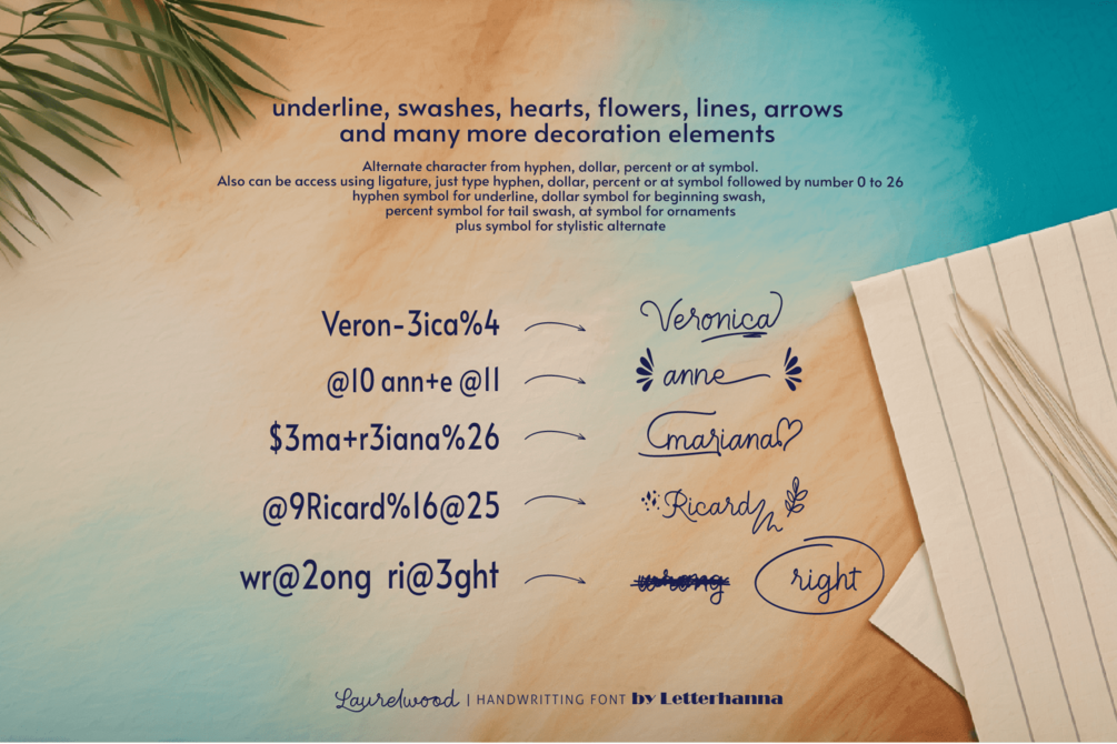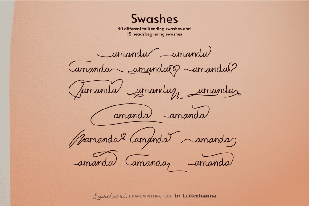 Gain easy access to all alternate glyphs, swashes, ornaments, and underlines by simply using ligatures. You can try them out yourself in the font preview tool on our website, letterhanna.com.