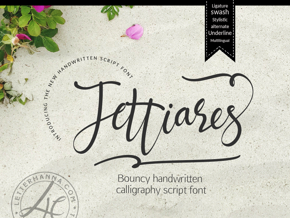 Jettiares is a bouncy handwritten calligraphy font, that comes with beautiful ligatures and lovely alternates. Jettiares has a very beautiful stroke and it will suit various logo design, poster, book cover, wedding invitations, fashion cards, and more. This font is PUA encoded which means you can access all of the glyphs and swashes with ease!