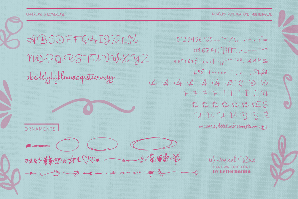 Introducing Whimsical Rose – a charming, flowery script font that dances with elegance and creativity. With its whimsical strokes and delicate curves, this handwriting font brings a touch of romance and artistry to every design. Perfect for branding, invitations, and heartfelt creations, Whimsical Rose adds a graceful flourish to your words. Let your creativity bloom!