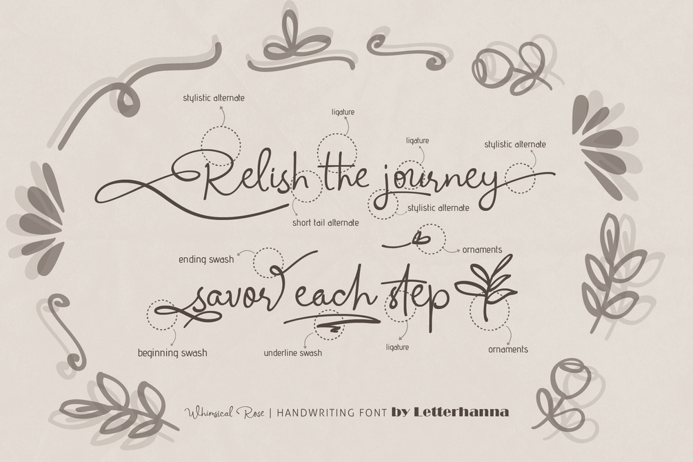 Gain easy access to all alternate glyphs, swashes, ornaments, and underlines by simply using ligatures. You can try them out yourself in the font preview tool on our website, letterhanna.com.