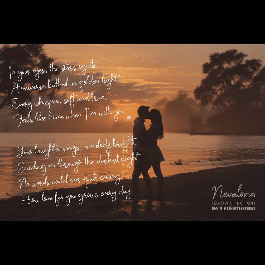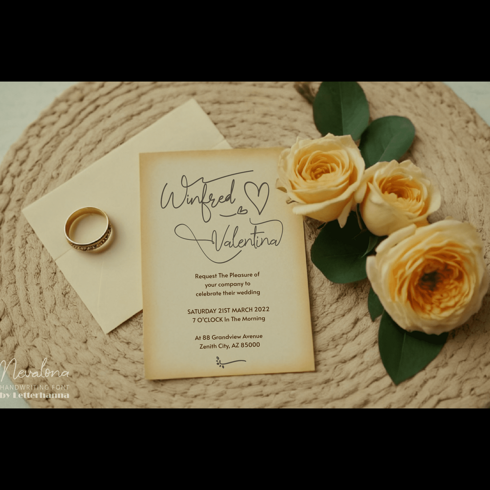 Introducing Nevalona, a beautifully crafted handwriting script font that blends elegance with a modern touch. With its smooth, flowing strokes and natural penmanship, Nevalona captures the essence of effortless sophistication, making it perfect for branding, invitations, logos, and creative projects. Let your words shine with a font that feels both personal and timeless.