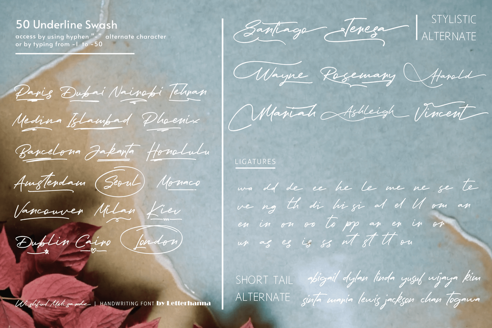 Gain easy access to all alternate glyphs, swashes, ornaments, and underlines by simply using ligatures. You can try them out yourself in the font preview tool on our website, letterhanna.com