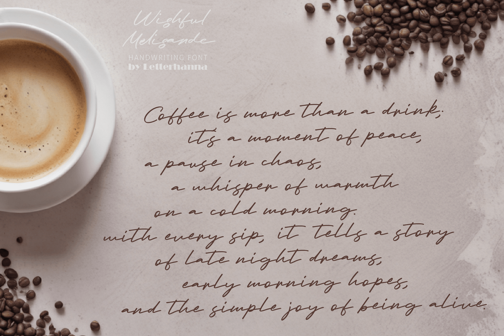 Introducing Wishful Melisande, a graceful and enchanting handwriting script font that captures the beauty of fluid strokes and delicate curves. Designed for those who appreciate elegance, this font blends natural hand-drawn charm with a touch of sophistication, making it perfect for branding, invitations, and artistic projects.