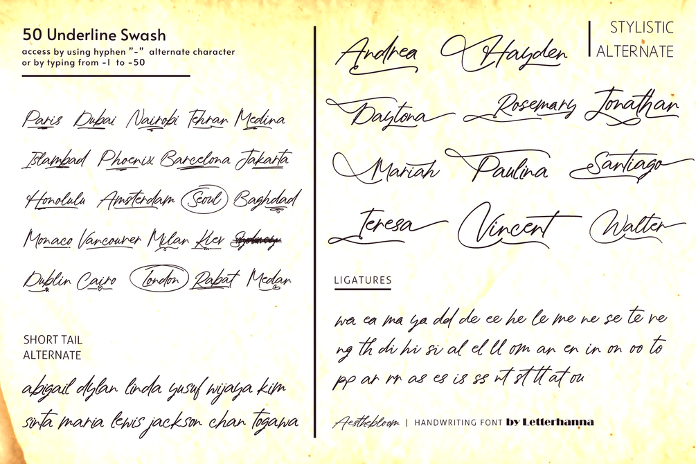 Aesthebloom Handwriting Font offers an extensive collection of stylistic alternates, swashes, and ligatures, allowing you to personalize your text with unique and expressive details. Whether you're looking for a modern chic vibe or a timeless calligraphic touch, this font adapts effortlessly to your creative vision. Elevate your typography with Aesthebloom and make every word a work of art.
