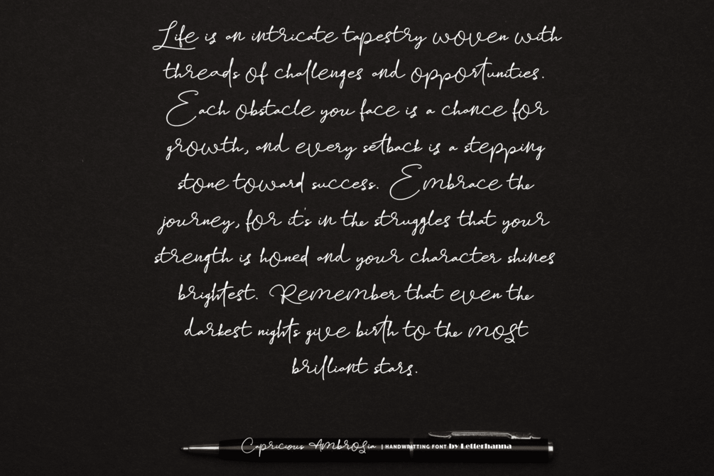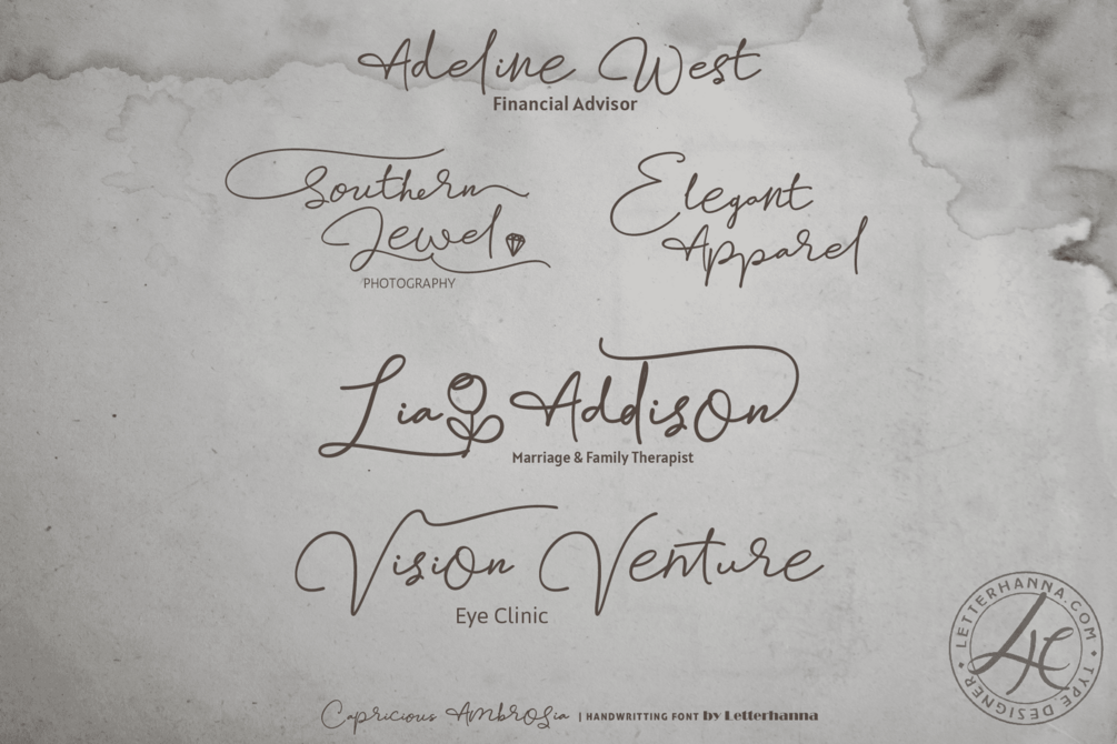Capricious Ambrosia Font was created to look as close to a natural handwritten script as possible by including over 45 natural-looking opentype ligatures, Uppercase and lowercase Stylistic Alternate, a lot of head/beginning swashes and tail/ending swashes. There are also underline swashes included and lot more ornaments, arrow, scribbles, etc.