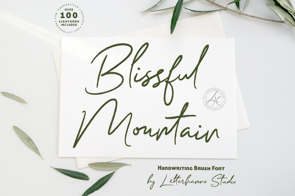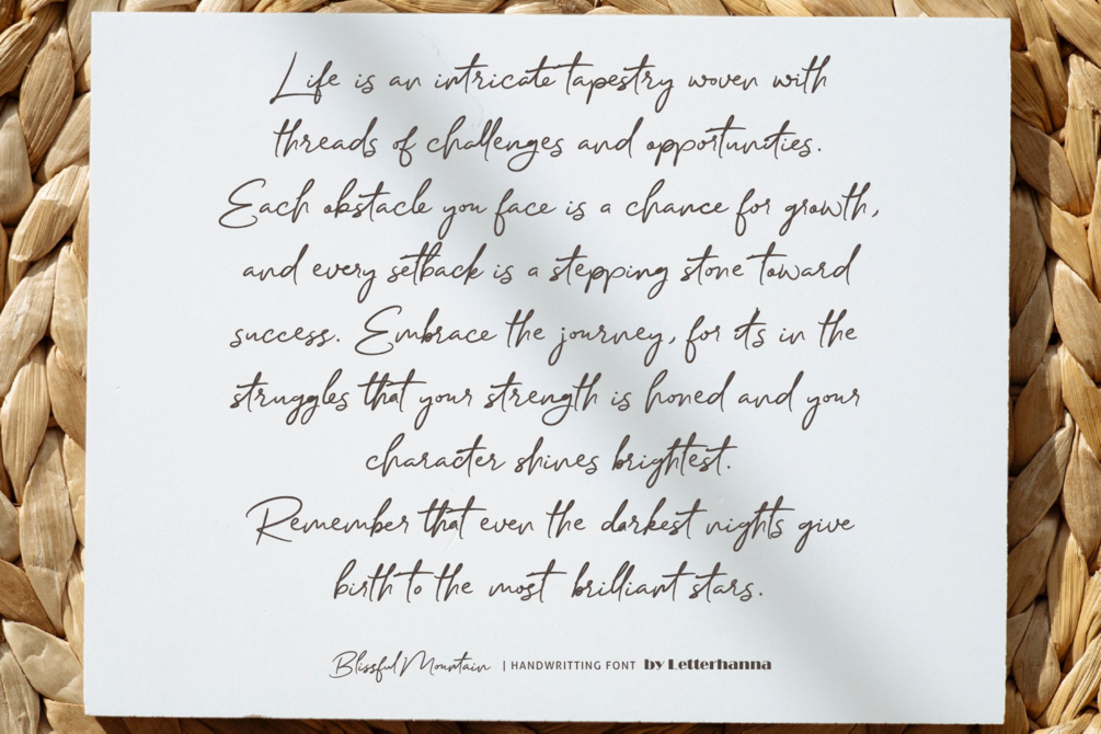 "Blissful Mountain" is not just a font; it's an invitation to explore the beauty and harmony of handwritten script. Whether you're crafting invitations, designing branding materials, or seeking to infuse your projects with a touch of natural wonder, this font will transport your audience to a serene landscape where every word becomes a breathtaking peak of expression.