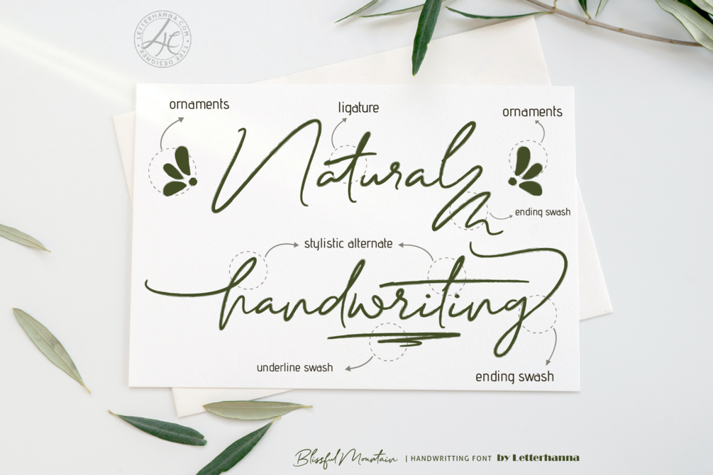 Blissful Mountain Font is also PUA encoded which means you can access all of the glyphs and swashes with ease!
