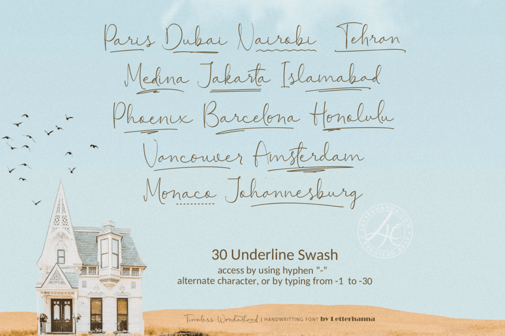 Timeless Wonderland Font is also PUA encoded which means you can access all of the glyphs and swashes with ease!
