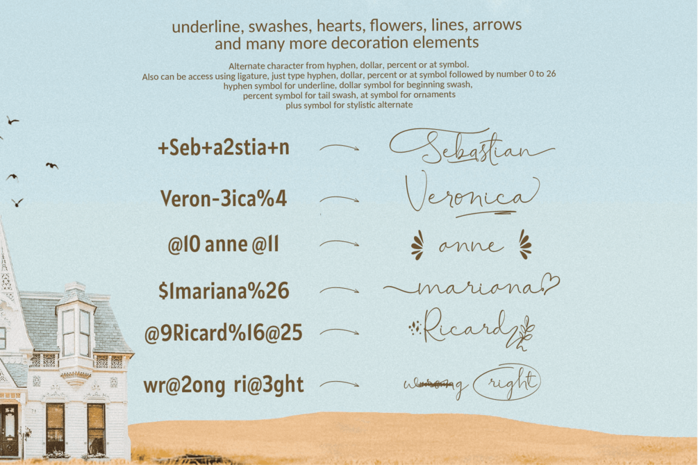 Easy access all alternate glyphs, swashes, ornaments and underlines just by using ligatures, you can try yourself in the font preview tool.