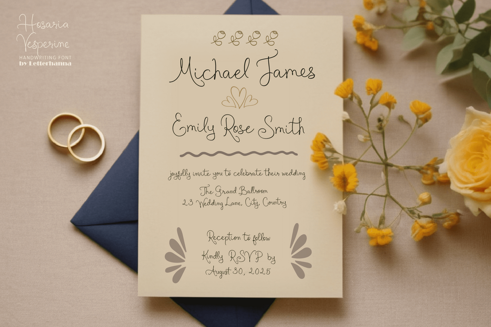 Meet Hosaria Vesperine — a graceful handwriting script font that dances with elegance and flair. Designed with love for detail, this font comes packed with stunning stylistic alternates, luxurious swashes, and charming ligatures to bring every letter to life. Whether you're crafting wedding invites, branding projects, or heartfelt quotes, Hosaria Vesperine adds that perfect handwritten magic.