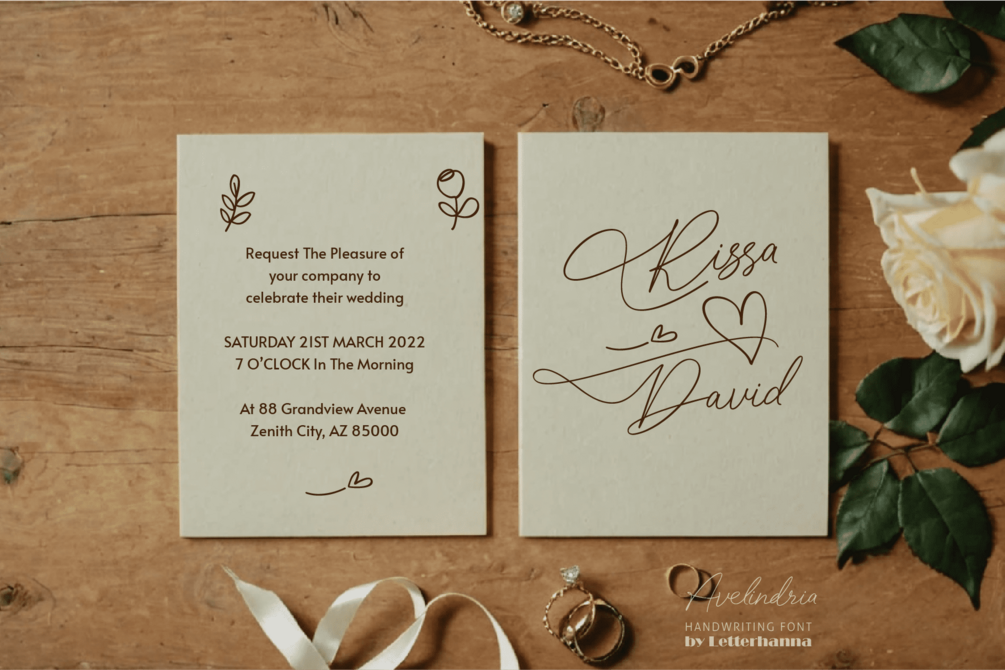 Introducing Avelindria, a captivating new handwriting script that embodies elegance and versatility. Designed to enthrall, Avelindria boasts a wealth of stylistic alternates, swashes, and ligatures, allowing you to craft text with unmatched personality and flair. Whether you're gracing invitations with a touch of timeless beauty or adding a flourish to logos and branding materials, Avelindria empowers you to express yourself with captivating individuality.