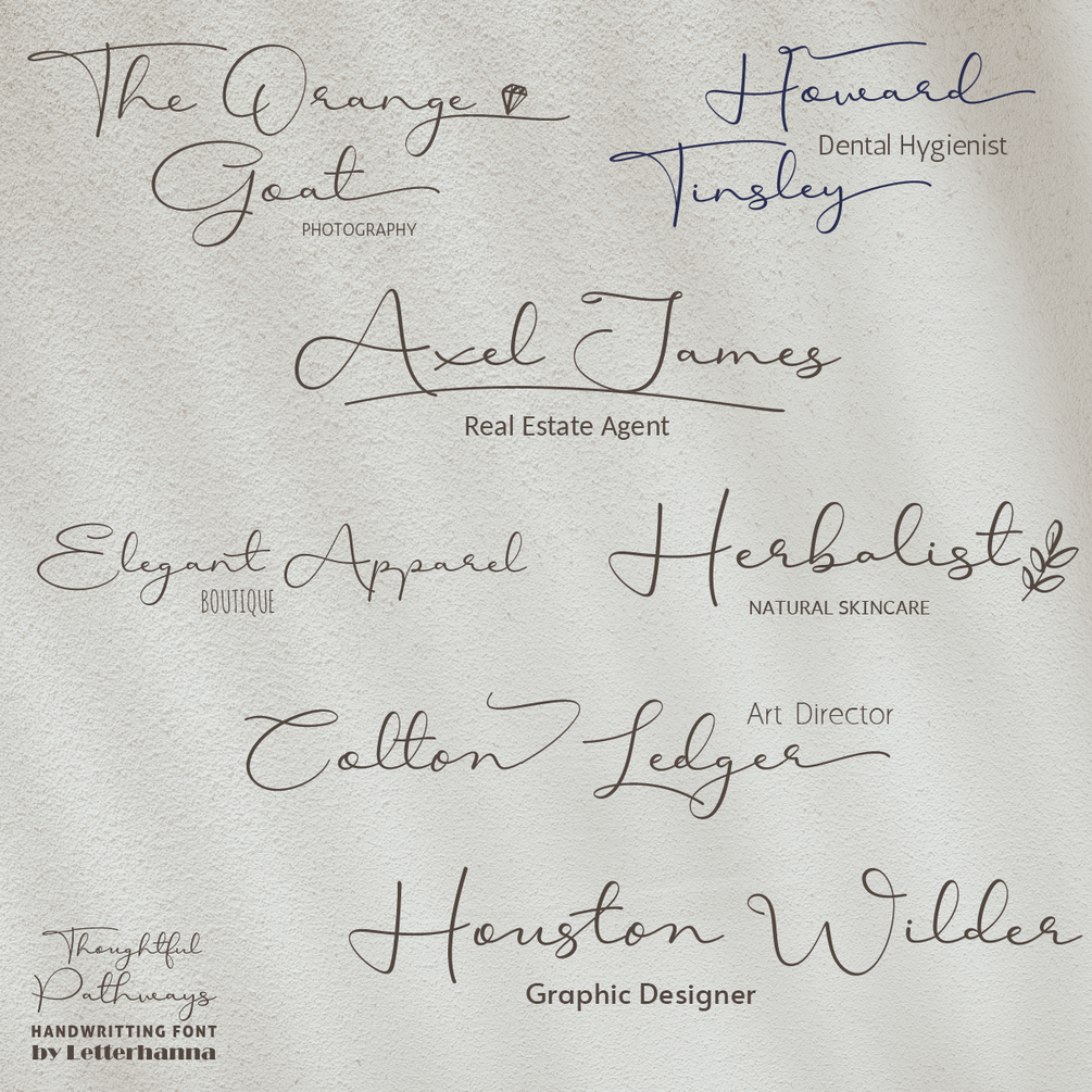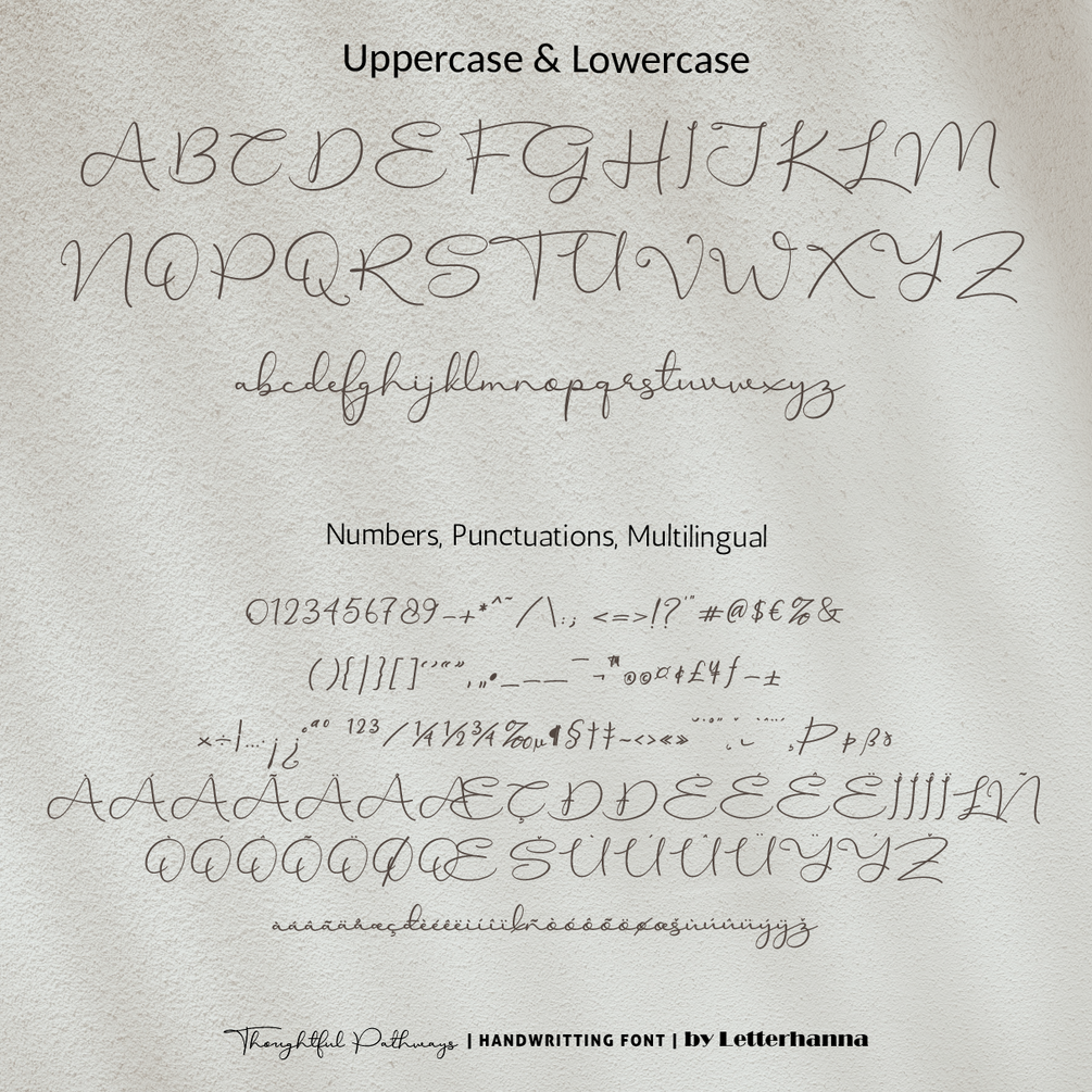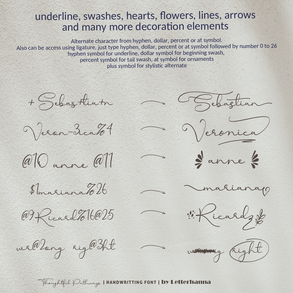 Thoughtful Pathways Font was created to look as close to a natural handwritten script as possible by including over 33 natural-looking opentype ligatures, Uppercase and lowercase Stylistic Alternate, a lot of head/beginning swashes and tail/ending swashes. There are also 30 underline swashes included and lot more ornaments, arrow, scribbles, etc.