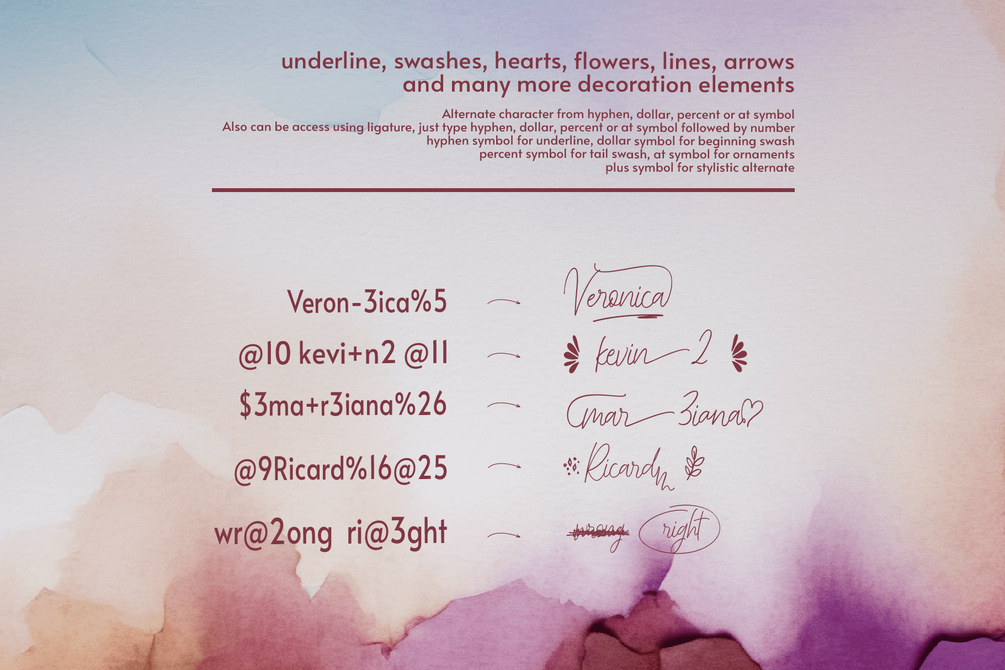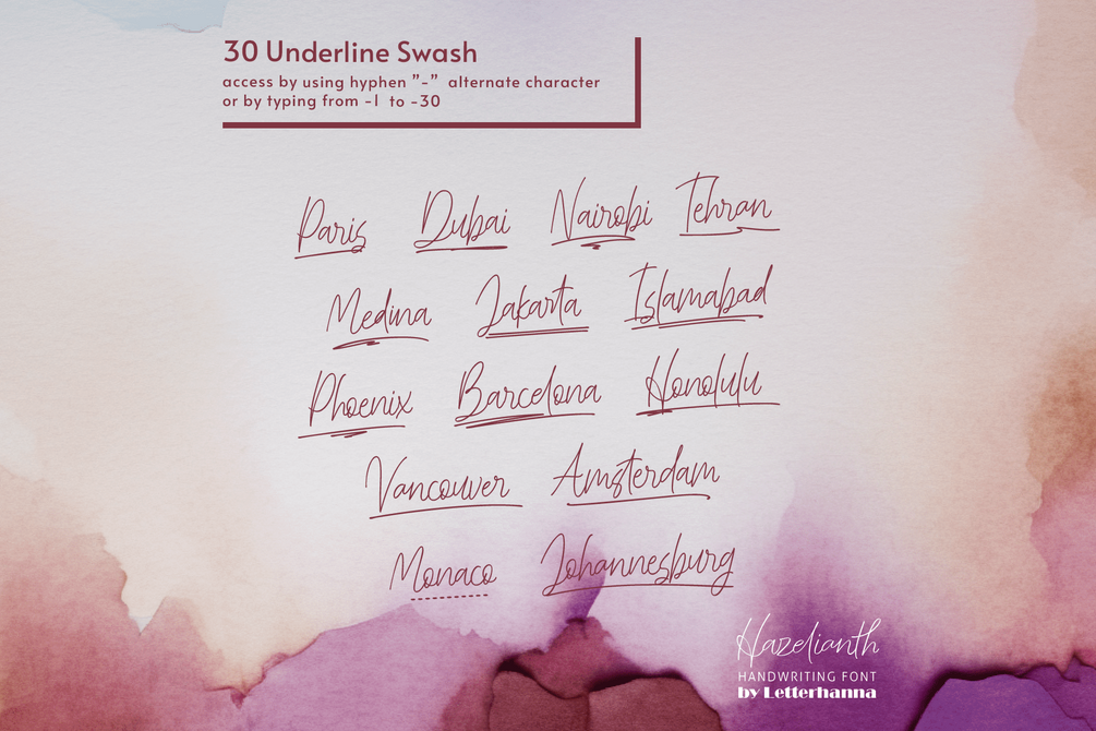 Gain easy access to all alternate glyphs, swashes, ornaments, and underlines by simply using ligatures. You can try them out yourself in the font preview tool on our website, letterhanna.com.
