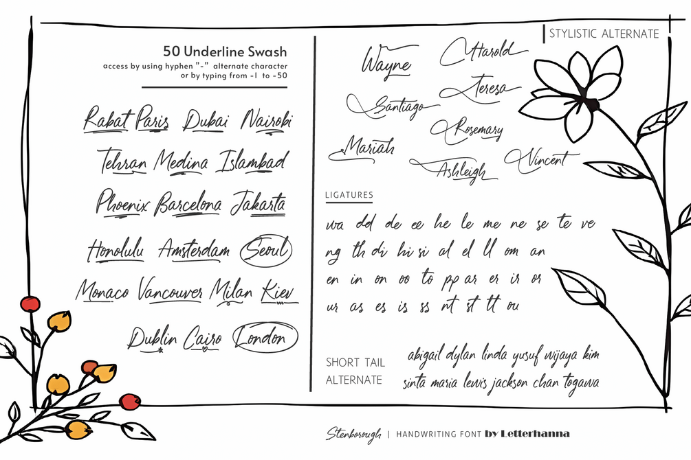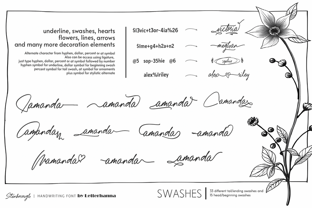 Gain easy access to all alternate glyphs, swashes, ornaments, and underlines by simply using ligatures. You can try them out yourself in the font preview tool on our website, letterhanna.com