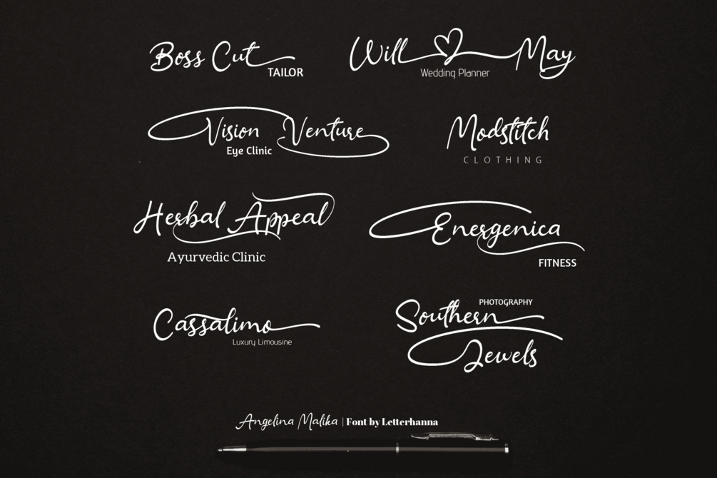 Angelina Malika is a bold calligraphic lettering script font. Fall for its ravishing style and use it to create gorgeous wedding invitations, beautiful logo, personal branding, eye-catching social media posts, and much more!