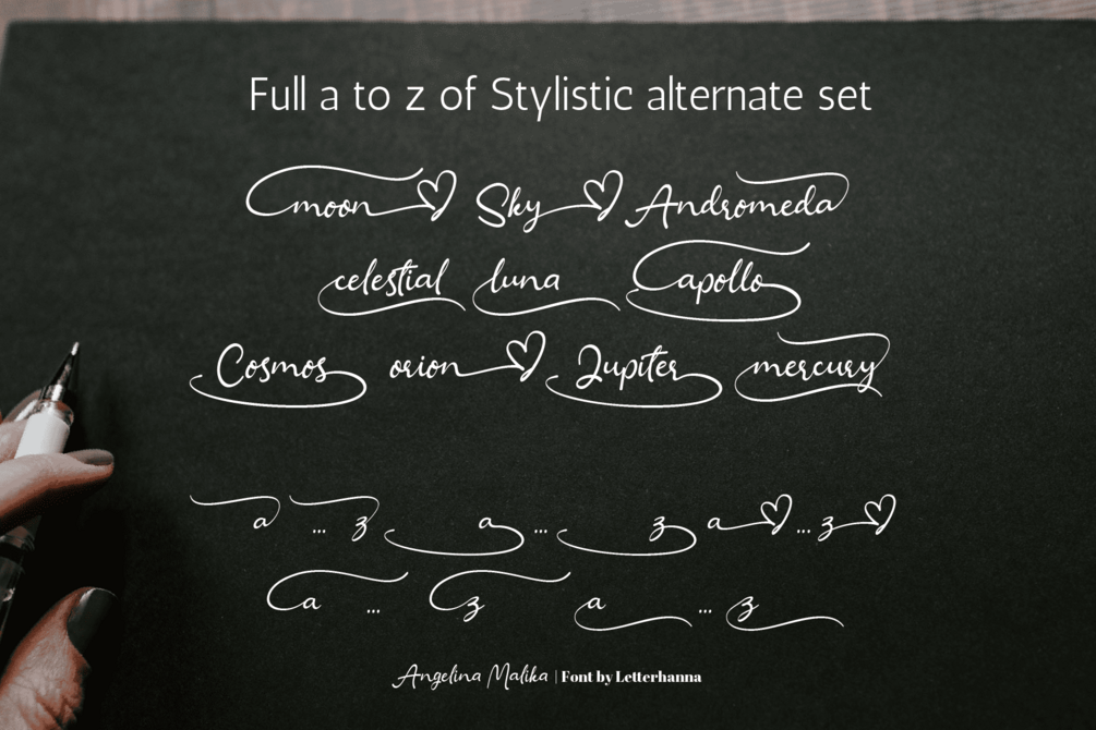 Angelina Malika Script Font was created to look as close to a natural handwritten script as possible by including natural-looking ligatures, and two full set of lowercase alternates tail, the tail will change using "contextual alternate" according to the letter in front of it. There are also 25 underline swashes included.