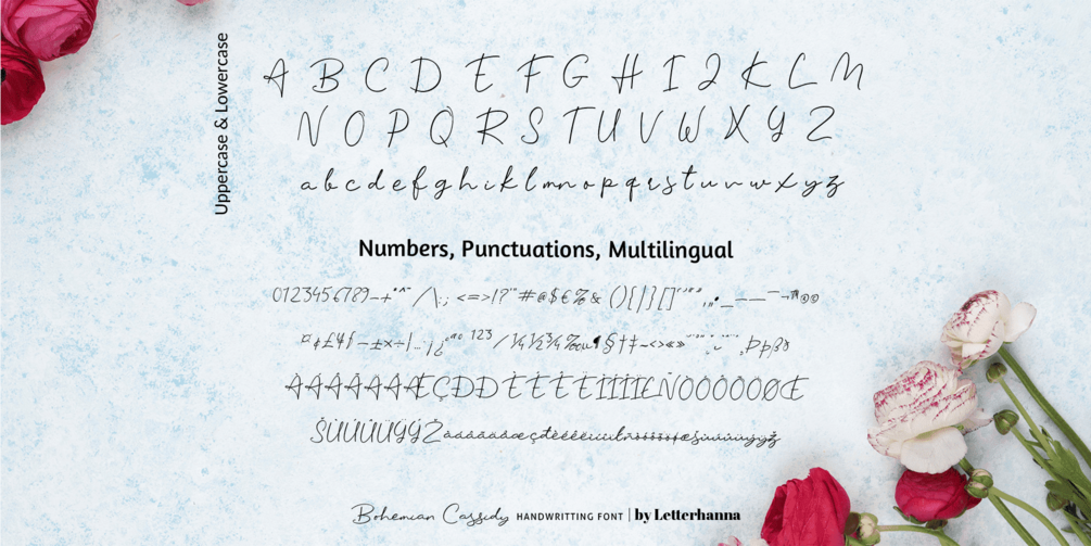 Bohemian Cassidy contains a full set of lower & uppercase letters, a large range of punctuation, numerals, and multilingual support.