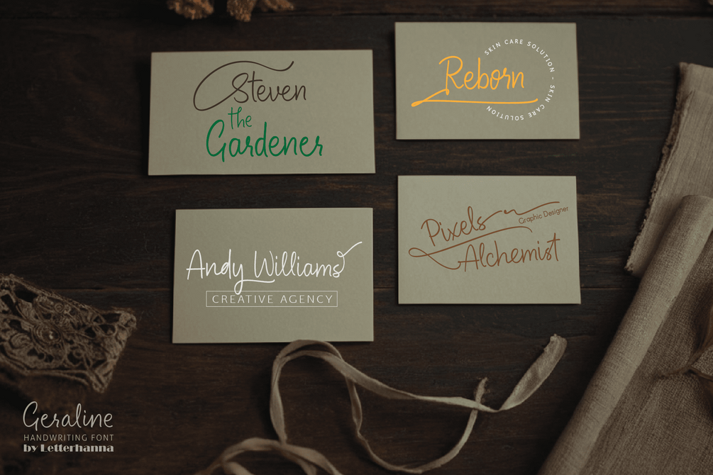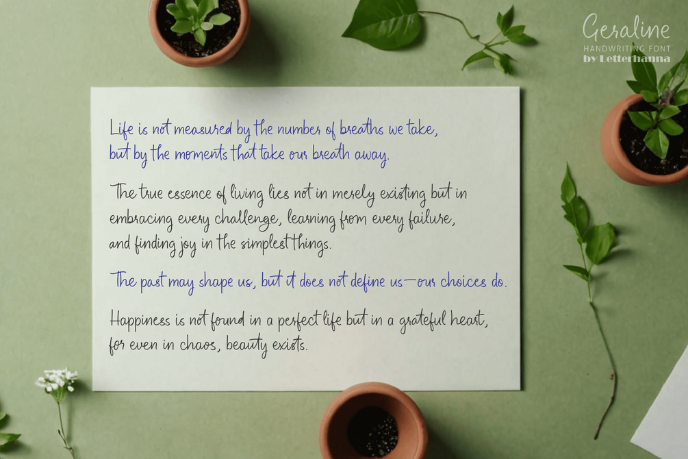 Geraline is a beautifully crafted handwriting script font that mimics the fluidity and charm of natural pen strokes on paper. With its organic flow and smooth curves, this font exudes warmth and authenticity, making it perfect for projects that require a personal and elegant touch. Whether you're designing wedding invitations, branding materials, or heartfelt quotes, Geraline adds a sophisticated yet approachable feel to your typography.