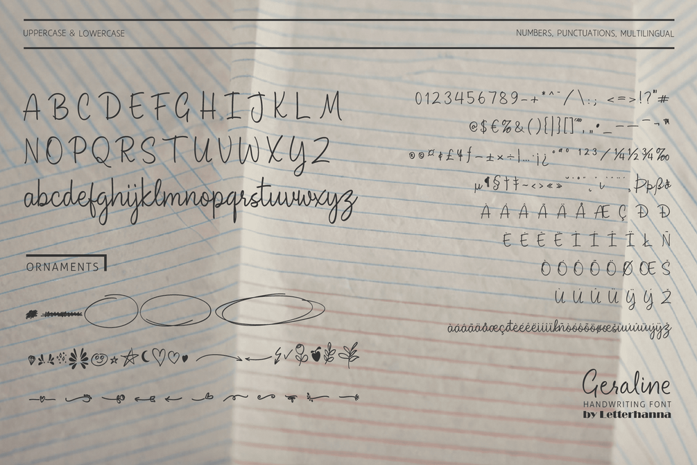 Gain easy access to all alternate glyphs, swashes, ornaments, and underlines by simply using ligatures. You can try them out yourself in the font preview tool on our website, letterhanna.com.