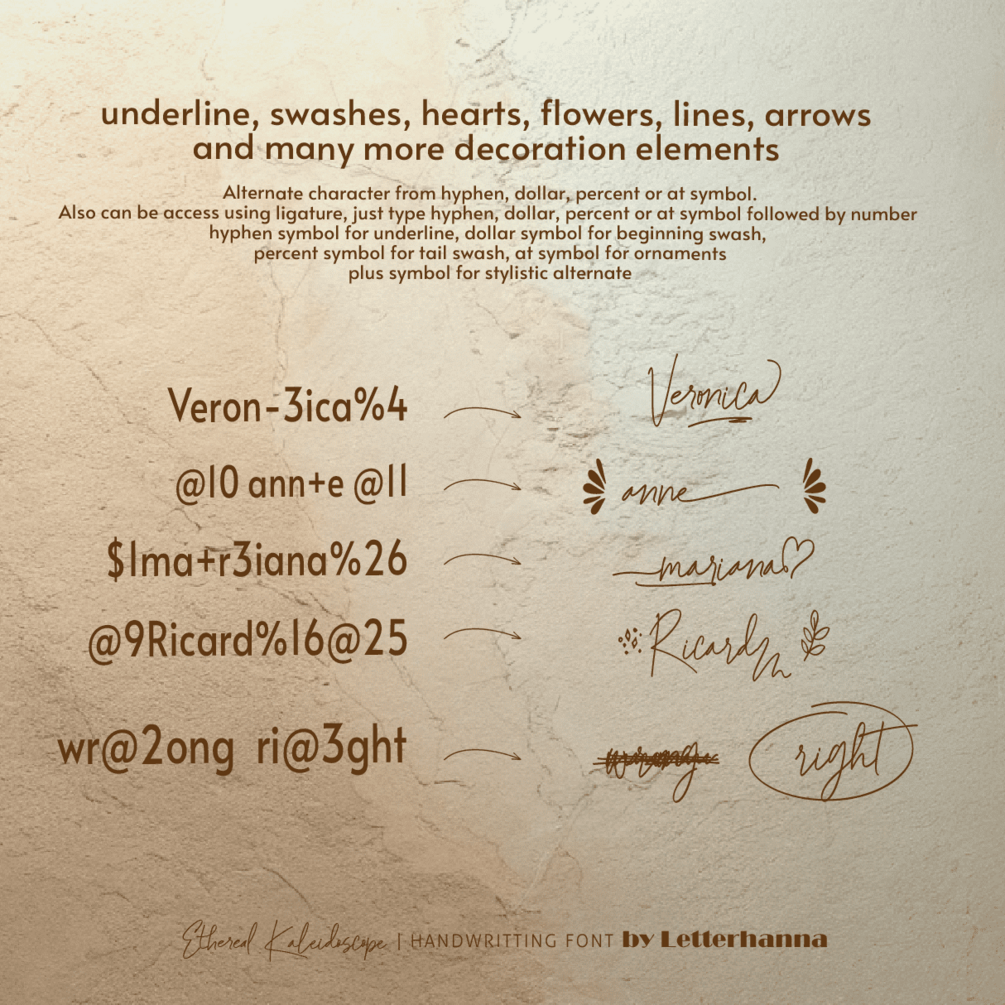 Gain easy access to all alternate glyphs, swashes, ornaments, and underlines by simply using ligatures. You can try them out yourself in the font preview tool on our website, letterhanna.com.