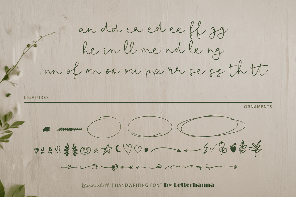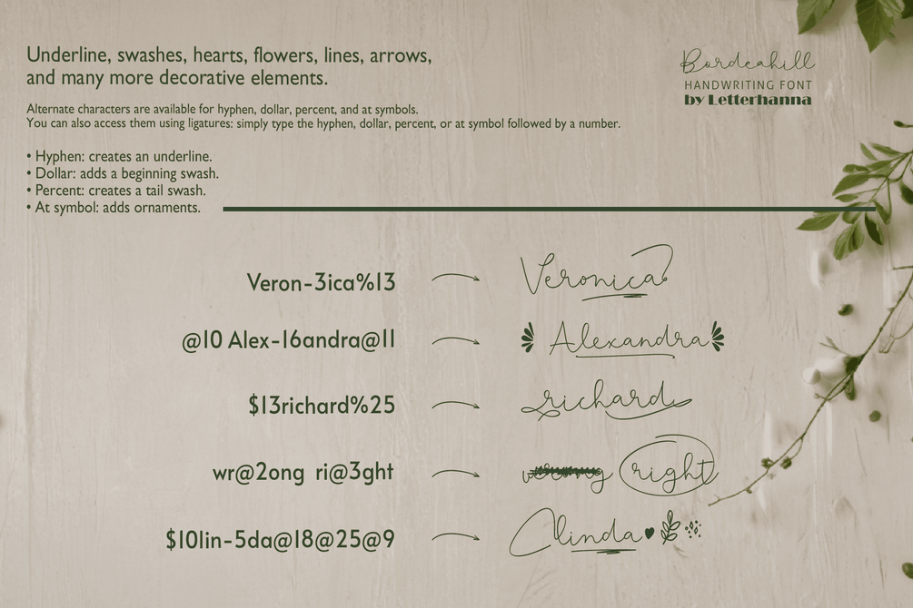 Gain easy access to all alternate glyphs, swashes, ornaments, and underlines by simply using ligatures. You can try them out yourself in the font preview tool on our website, letterhanna.com.