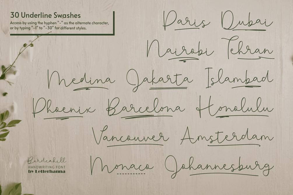 Bordeahill offers versatile features, including stylish swashes and alternate characters, giving you endless possibilities to customize your designs. Its timeless appeal and modern touch make it a must-have for anyone looking to add a personal, artistic feel to their work. Make your creations unforgettable with Bordeahill—the script font that brings your ideas to life!